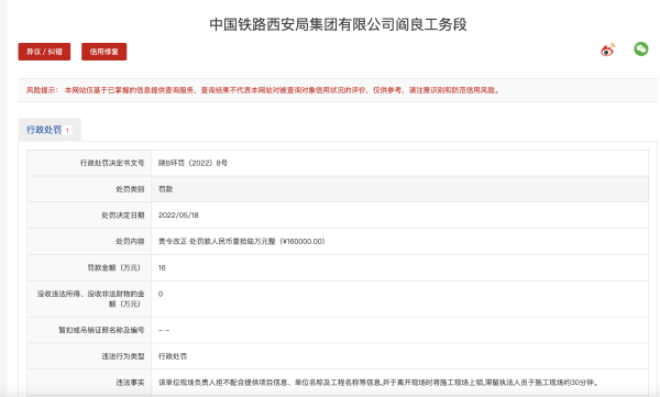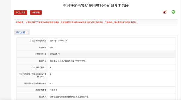 原标题:将施工现场上锁滞留执法人员,西安铁路局阎良工务段被罚