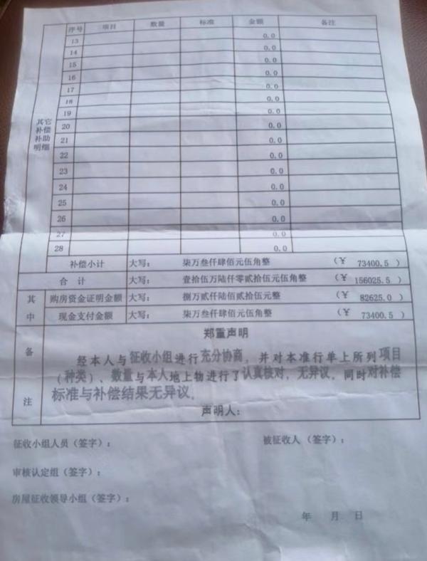 该文件同时表示,“另据了解,征收人员曾与申请人协商,意向对该户货币化购房安置,现金补偿及购房卡补偿合计15.6万元。申请人要求全部现金,之后根据自己的条件自行购买……”