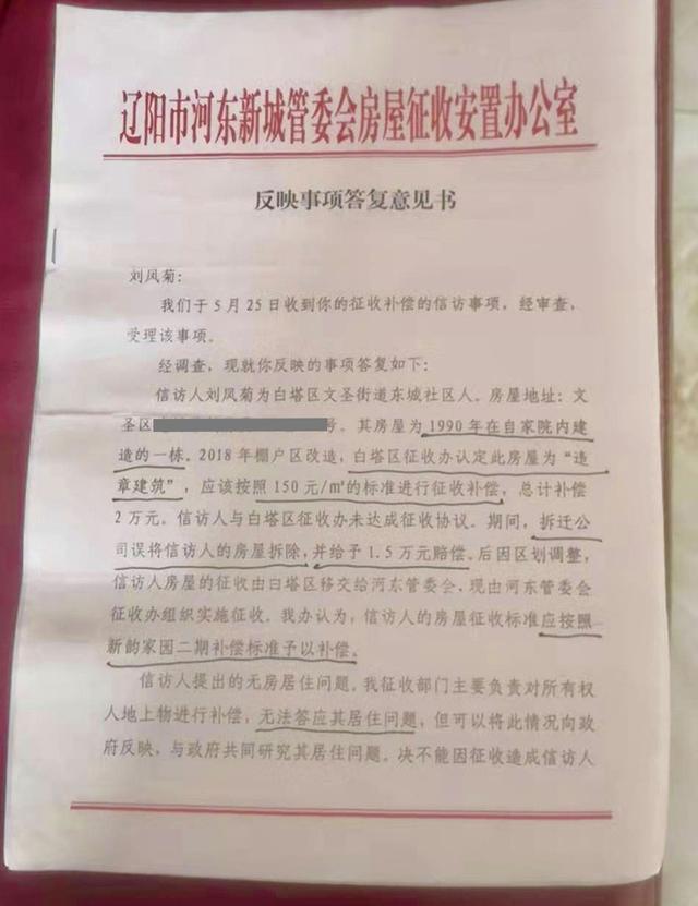 前述三份加盖有红色公章的文件显示,涉事房屋是刘凤菊家的自建房,1990年建成,面积43平方米,用于自住;2018年,当地实施棚户区改造项目,对该房屋进行征收;但双方尚未达成征收协议,涉事房屋被拆迁工程队拆除。随后,因区划调整,涉事的房屋的征收工作由辽阳市白塔区,移交给文圣区河东新城管委会,“现由河东管委会征收办组织实施征收。”