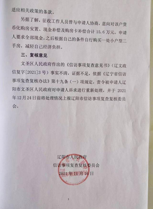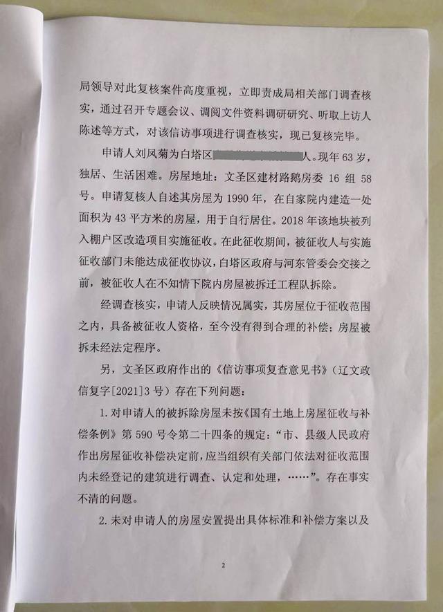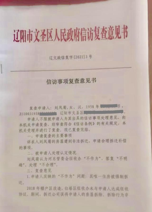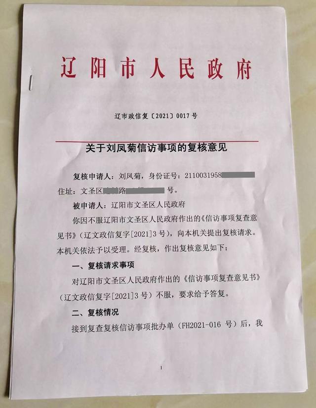又过了三个月,2021年11月16日,辽阳市人民政府相关复核意见书称,“经调查,申请人(注:刘凤菊)反映情况属实,其房屋位于征收范围内,具备被征收人资格。至今没有得到合理的补偿,房屋被拆未经法定程序。”“责令被申请人辽阳市文圣区人民政府对申请人(刘凤菊)诉求进行重新处理,并于2021年12月24日前将处理情况上报辽阳市信访事项复查复核委员会。”