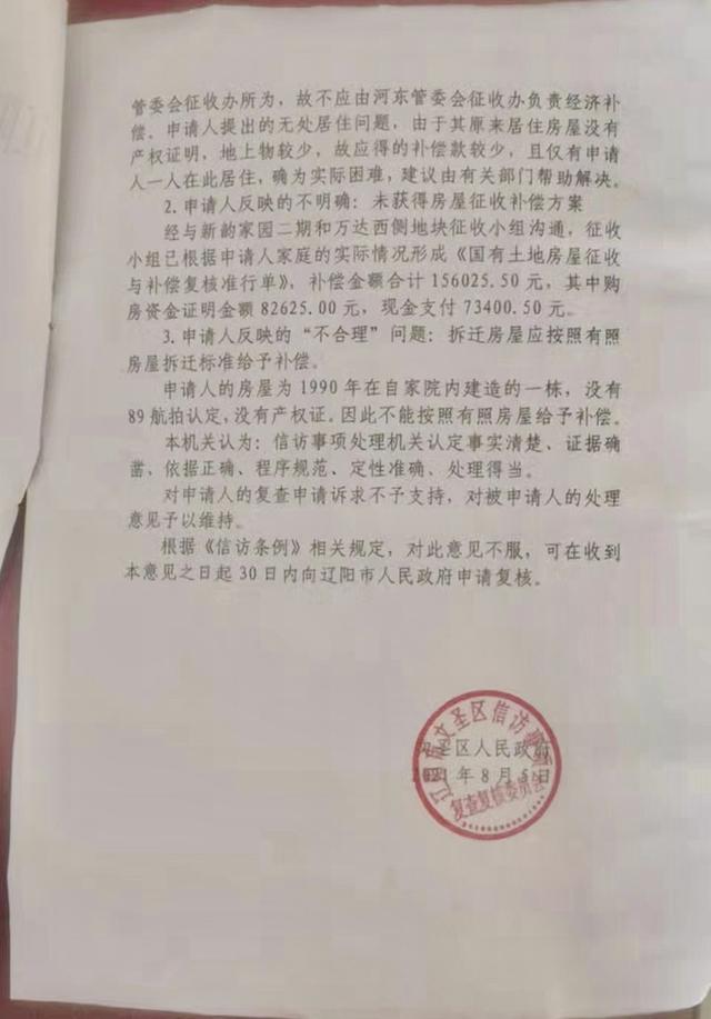 三个月后,文圣区人民政府相关部门2021年8月出具的信访复查意见书称,“经与新韵家园二期和万达西侧地块征收小组沟通,征收小组已根据申请人的家庭情况形成《国有土地房屋征收与补偿复核准行单》……其中购房资金证明金额82625.00元,现金支付73400.50元。”