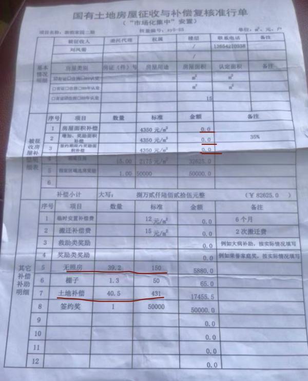 刘凤菊说,在那栋房子里住了快三十年后,2018年左右,当地进行棚户区改造,要连片征收拆迁,按照有照房、无照房两种标准对房屋进行征收。她的住房43平方米,按无照房的标准150元/平方米补偿,加上430元/平方米的地价补偿,加起来一共才补偿两万多元。