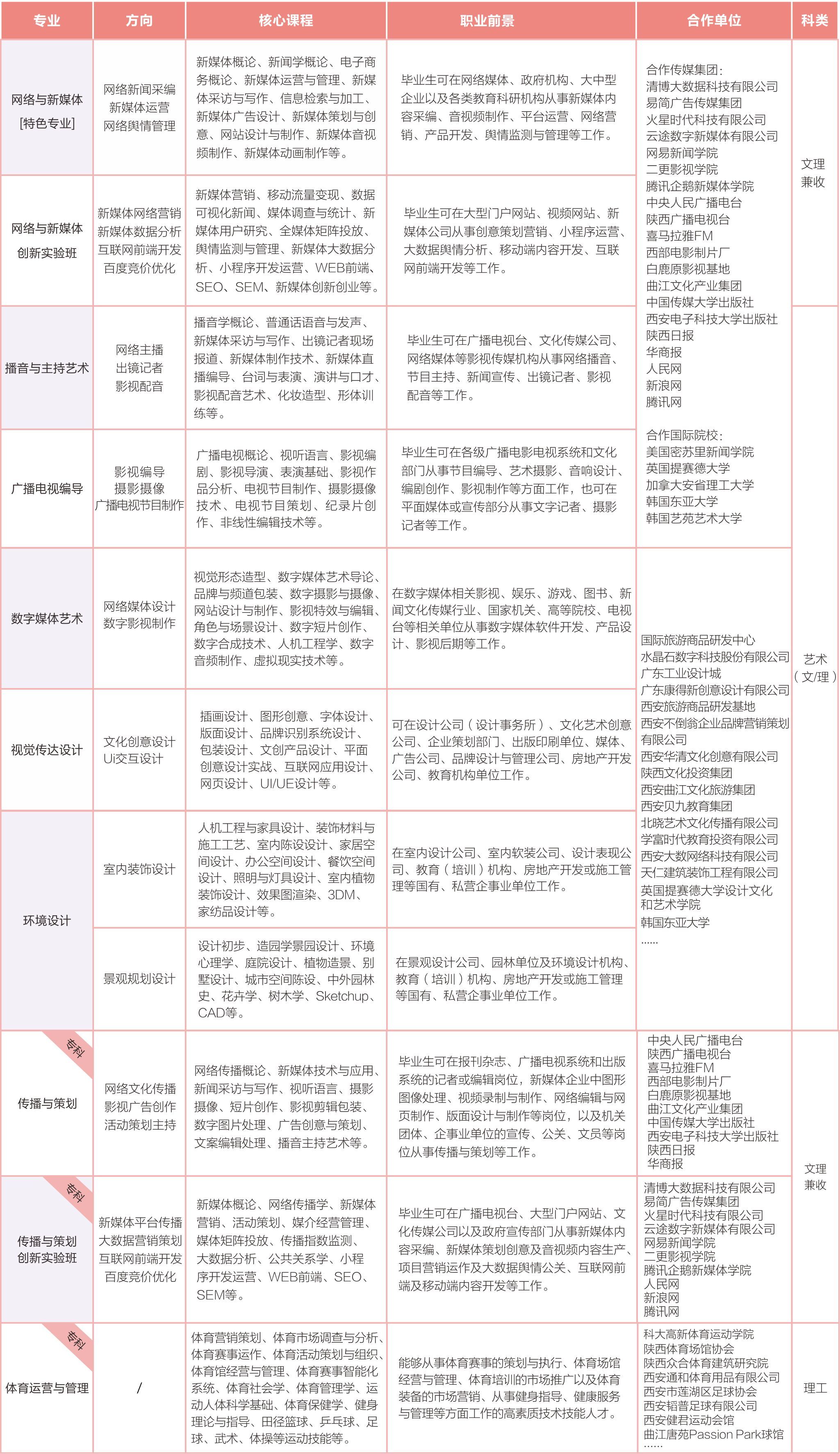 新传媒与艺术学院下设网络与新媒体(特色专业)、播音与主持艺术、广播电视编导、视觉传达设计、环境设计、数字媒体艺术、产品设计7个本科专业和体育运营与管理、传播与策划2个专科专业。