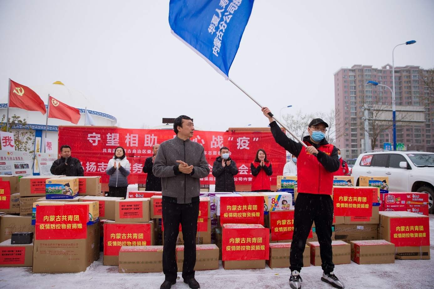 在抗击疫情的关键时期,内蒙古分公司第一时间赠送抗疫一线急需的防护服、面罩、口罩、消毒液及米、面、油生活必需品,并为一线重点防护区的志愿者们赠送累计保额达9070万元意外伤害保险及防疫保险保障。致敬逆行者,慰问支援额济纳旗感染者救治医护人员及一线值守的志愿者。同时,内蒙古分公司组成“内蒙古华夏人寿青年志愿者服务队”,青年员工积极参与疫情防控工作,支持自治区疫情防控和志愿服务事业发展,常态化开展疫情防控和应急志愿服务工作。