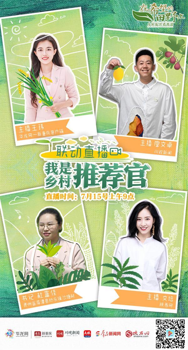 “乡村推荐官”华龙网-新重庆客户端主播王玮、川观新闻主播廖文卓、贵州省湄潭县抄乐镇沙塘村第一书记杜富佳、陕西网主播文培带你走进希望的田野,品美食、看美景、体验非遗特色,通过直播沉浸式打探各具特色的美丽乡村,让大家看到不一样的西部!本次联动直播还特别设置了抽奖环节,15日上午9:00,敬请锁定直播间!