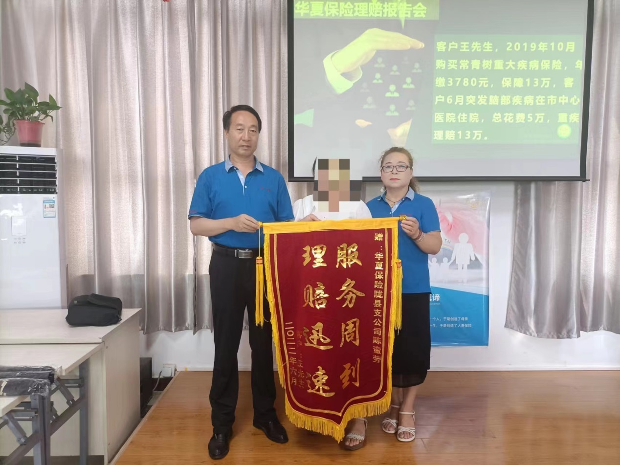 客户于2019年10月8日为自己投保华夏保险常青树(多倍2.0版)重大疾病保险,保额13万。2022年4月客户因身体极度不适前往医院检查,4月8日不幸被确诊为脑动脉瘤重大疾病。华夏保险宝鸡中支工作人员接到消息后,第一时间帮助客户梳理理赔资料并启动核查程序。核实无误后赔付客户13万元,解决了客户的燃眉之急。