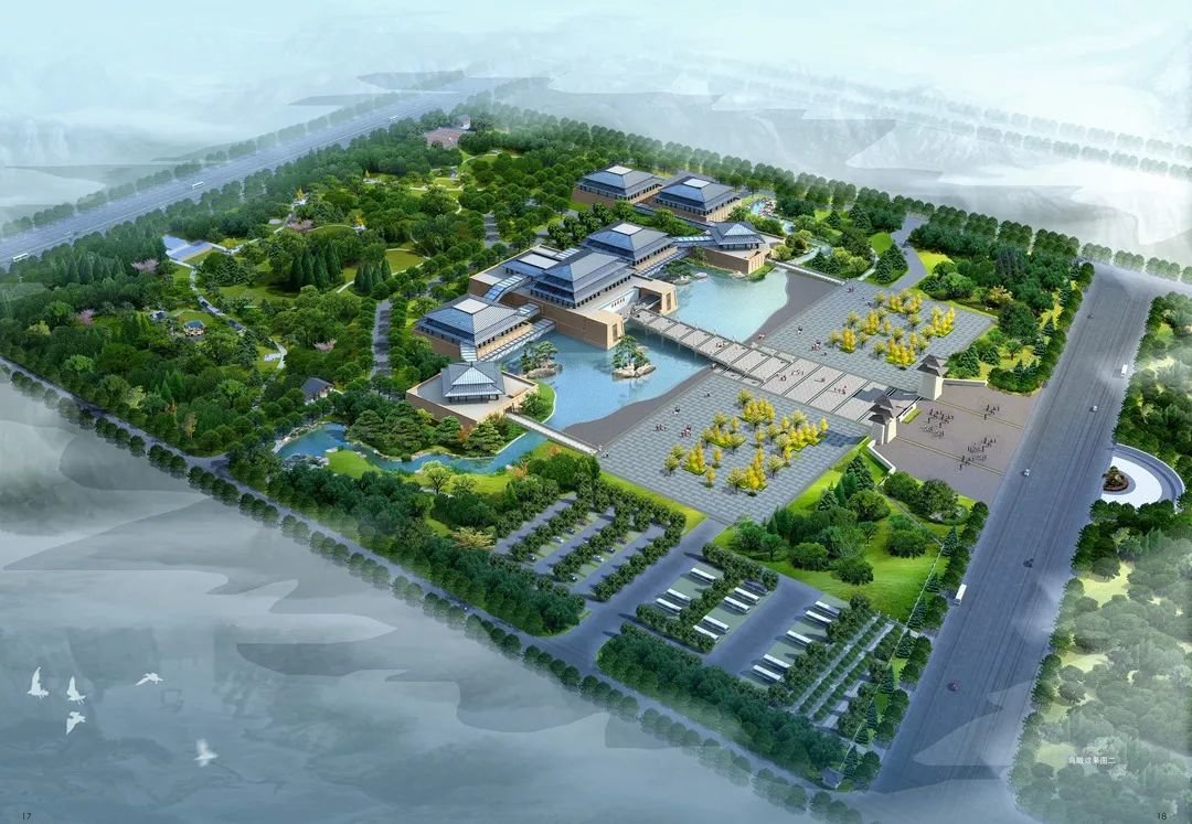 博物馆南面景观水体,象征“天汉”——银河,景观水体采用旱喷水雾形式,营造如梦如幻的效果,让游客仿佛置身九天云霄。长长的“横桥”,从博物馆主入口广场飞跨“银河”,直通建筑的二层平台,平台前是从“天”而下的水幕,横桥由低而高、近宽远窄,在形成博物馆超乎寻常、气势恢弘入口空间的同时,也将主体建筑衬托得更加雄伟壮观。