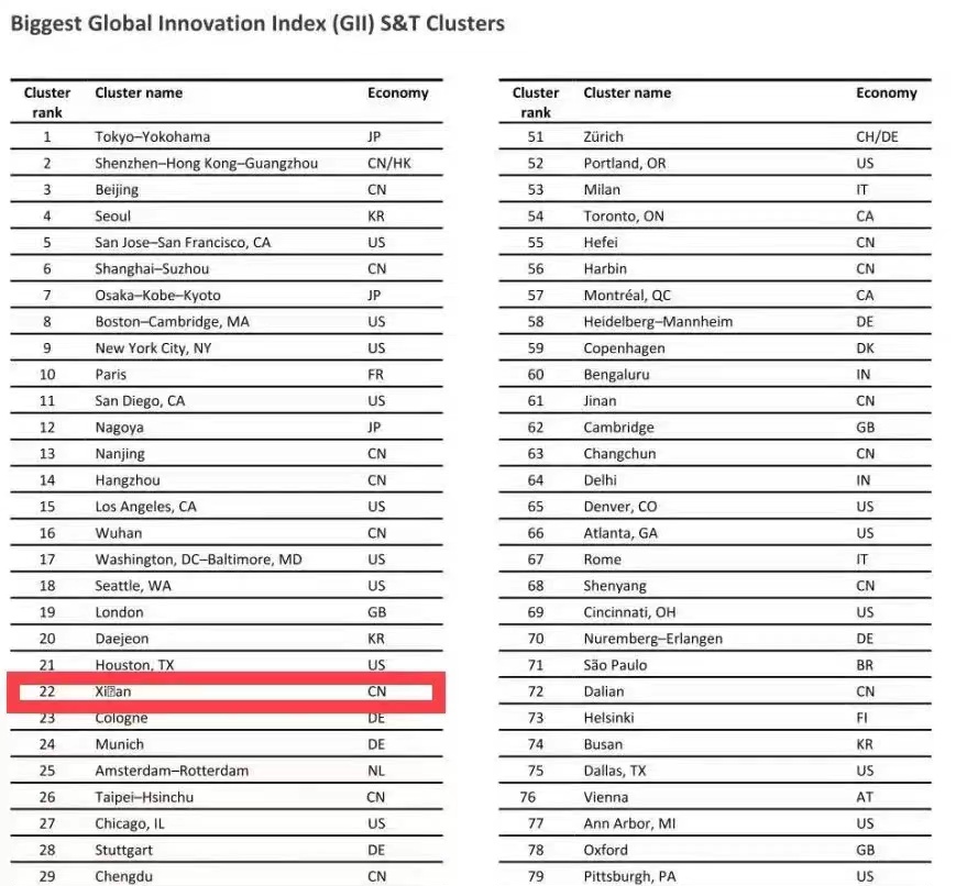 9月14日,世界知识产权组织(WIPO)日内瓦总部预发布2022版全球创新指数(GII)全球“科技集群”排名报告,其中西安排名全球第22位,位列中国上榜集群第7位。