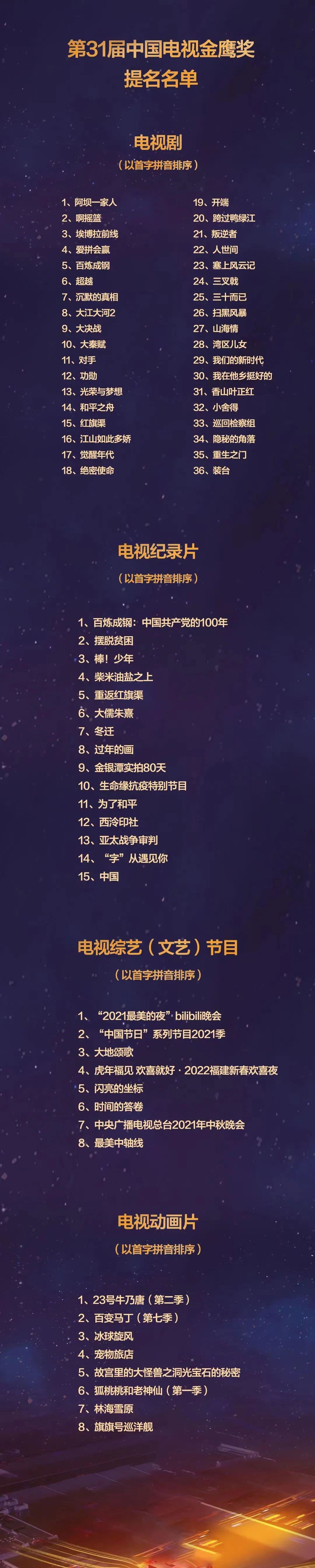 本届中国电视金鹰奖自启动以来,共收到电视剧、电视纪录片、电视综艺(文艺)节目、电视动画片四个类别的参评作品610部。此次入围提名名单的,包括36部电视剧、15部电视纪录片、8部电视综艺(文艺)节目、8部电视动画片。