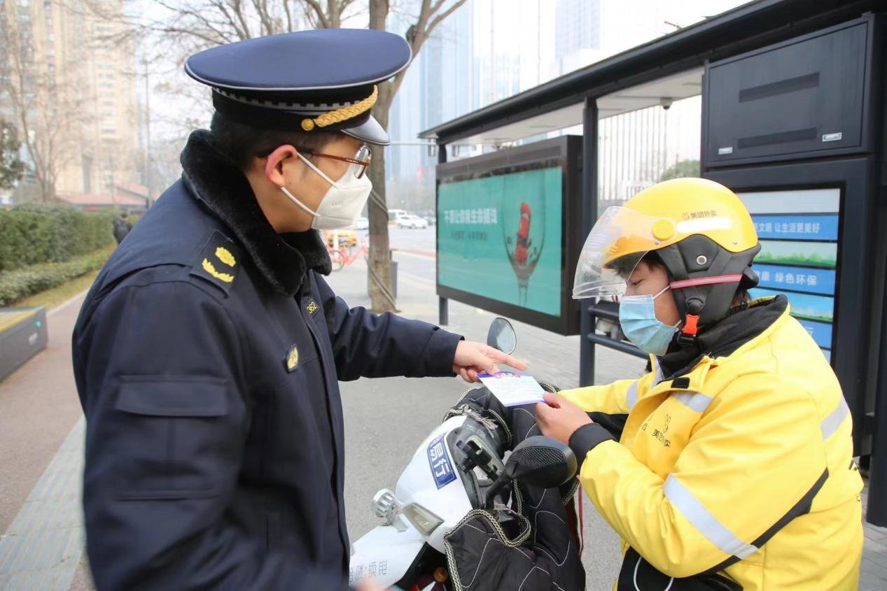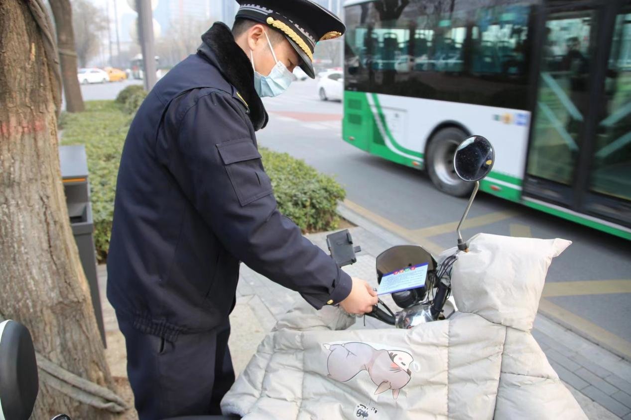在日常巡查中,针对非机动违法停放行为,执法人员采取规范引导、普法宣讲、温馨提示、车辆挪移相结合的方式,及时引导在场车主将非机动车辆停放至指定区域或单位内部停车场,并对车主进行法律法规和交通安全宣传;对车主不在场的,执法人员在车辆醒目位置逐个张贴“温馨提示单”,提醒车主不要将非机动车辆停放在城市道路上,不得占压盲道、消防通道、绿化等区域,并严格遵守交规,规范停放车辆。对车主拒绝驶离、占压盲道、消防通道或严重影响行人和车辆通行的违停车辆,执法人员将车辆进行挪移,最大限度减少违法停放车辆对交通的影响。