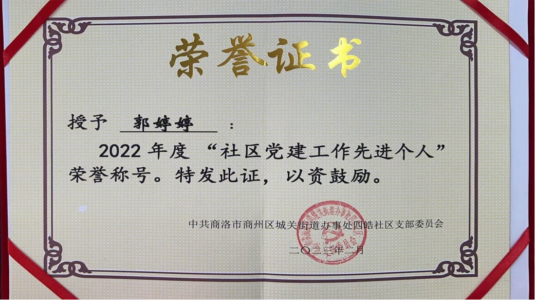 近日,中共商洛市商州区城关街道办事处四皓社区支部委员会向华夏保险商洛中支郭婷婷颁发2022年度“社区党建工作先进个人”荣誉证书。