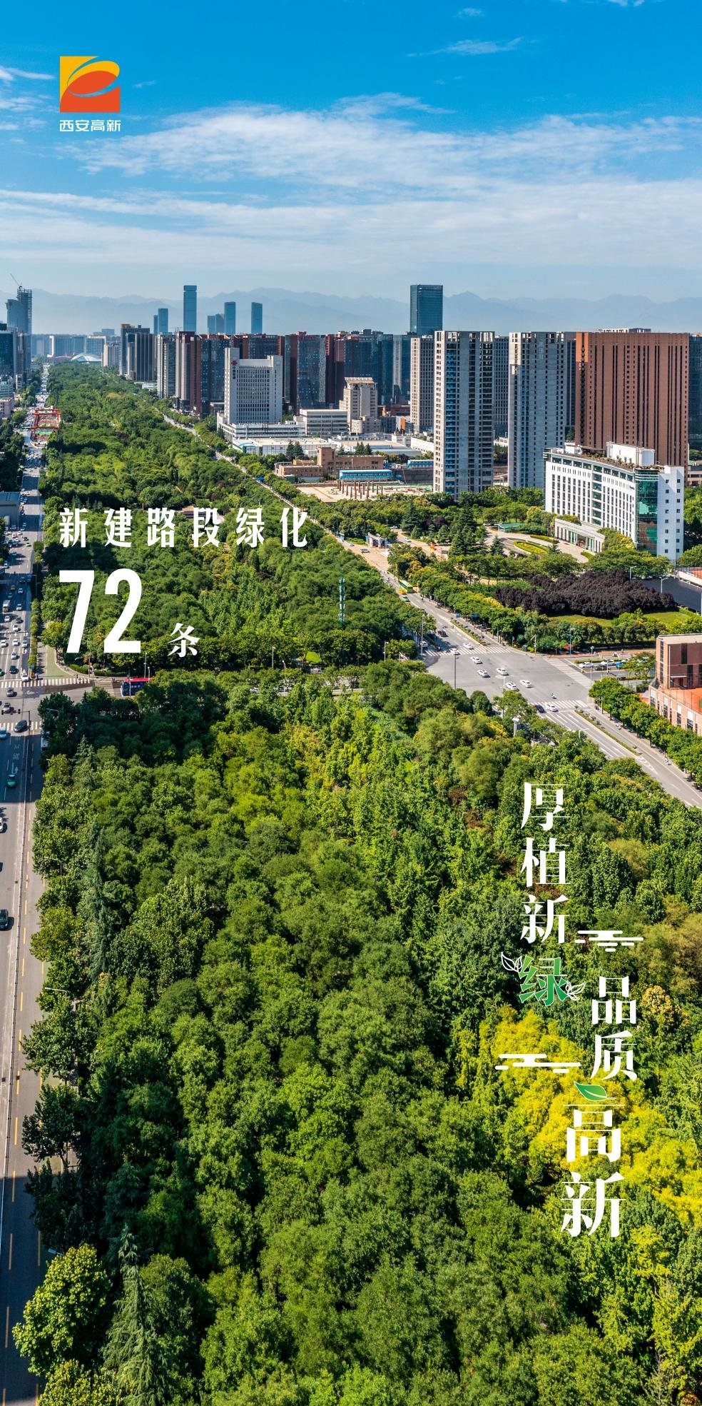 2022年,西安高新区新建72条路段绿化,部分重要路段建有20米宽的公共休闲绿带,让周边居民行在道路旁,走在风景间。