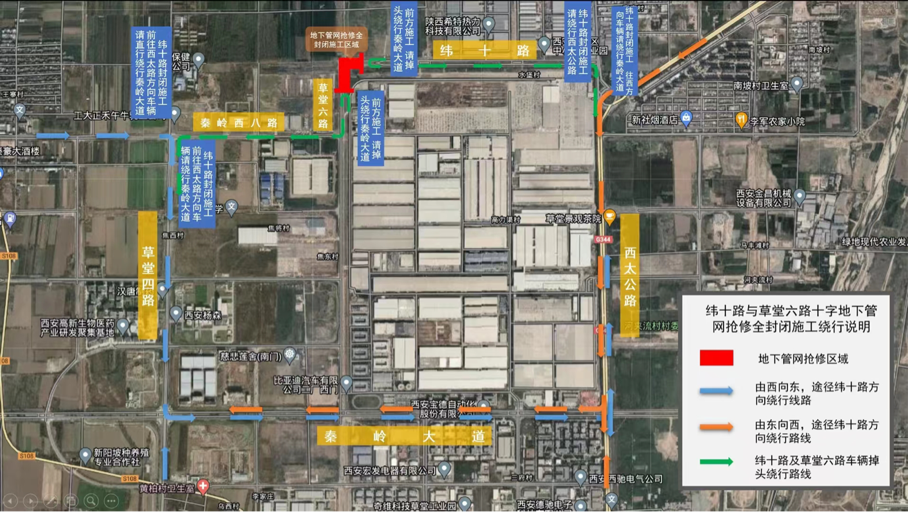 2023年3月19日零晨至2023年5月20日 23:00,将对纬十路与草堂六路十字进行全封闭抢修施工。抢修期间,纬十路向西(向东)通行车辆可提前由草堂大道、秦岭大道、草堂四路、秦岭西八路绕行。