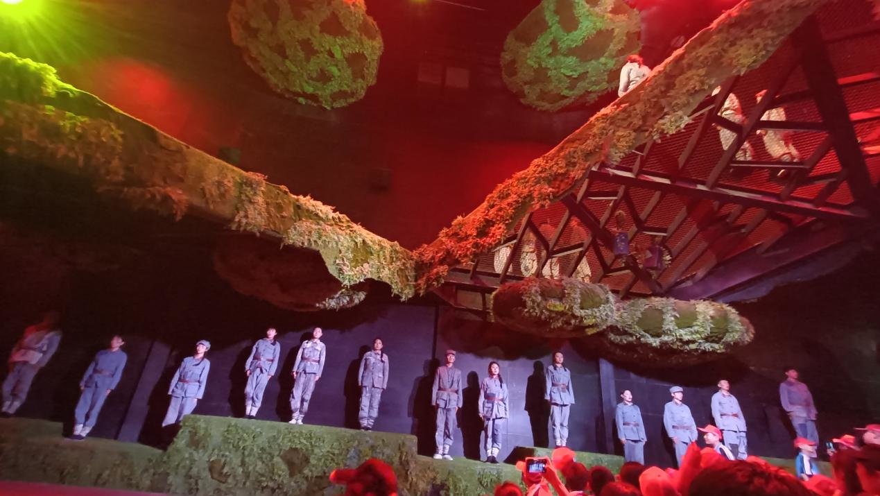 紧接着,全员观赏大型红色室内情景体验剧《再回延安》,《再回延安》以老红军刘宝顺的日记展开,从聆听红军讲述长征故事开始,用倒叙的方式将大家拉回战火纷飞的红色年代,分别以一间记忆的博物馆、一簇燎原的星火、一条漫漫的长征路、一面不朽的旗帜四个序幕,再现了当年革命前辈在翻阅雪山、过草地的光辉场景,在声、光、电等高科技的赋能下,大家仿佛置身于那段艰苦的长征岁月,令人激情澎湃,热血翻涌。演出在《歌唱祖国》的大合唱中落下帷幕,当242平米的红旗飘向观众,大家纷纷伸手去触摸,从中感受力量,精神得到洗礼。