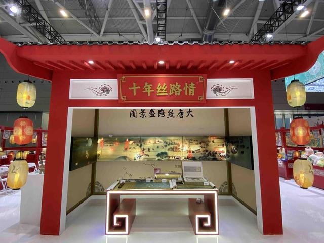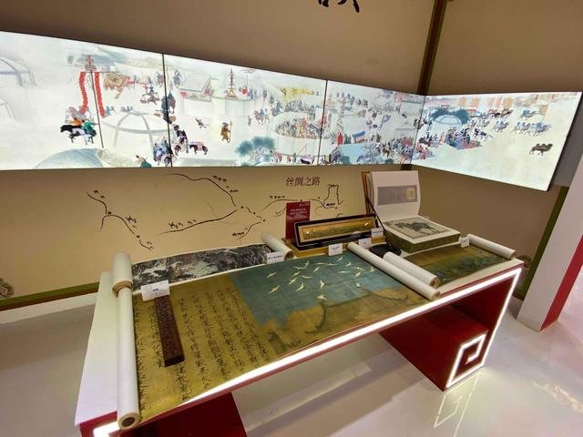 “美美与共丝路华章”文化交流活动主题板块区域,以陕西省工笔画院院长雒建安先生创作的16米巨幅工笔人物画长卷《大唐丝路盛景图》为蓝本,结合“一带一路”国际文化交流各项活动盛况,设置了全景互动空间,回顾“一带一路”倡议提出十年来蓝图变实景的各项文化交流成果。