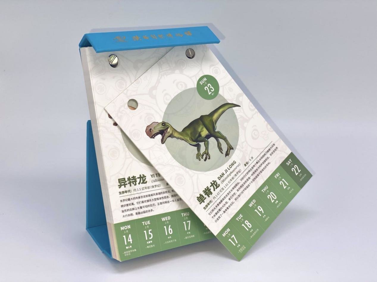 《2022年恐龙日历》是由博物馆联合核桃编程共同开发,并由专业古生物研究团队及三位新锐插画师精心打造。恐龙日历首页融入博物馆 IP形象“四宝看世界”人物,设定每周展示一种恐龙造型与知识,恐龙插画全部为原创手绘,同时在下方展示6种古生物小日签,全本一共包含 53 种恐龙及 313个古生物日签,既是一本实用性超强的日历,又是一本恐龙知识大全,更是一本有趣的儿童科普读物。