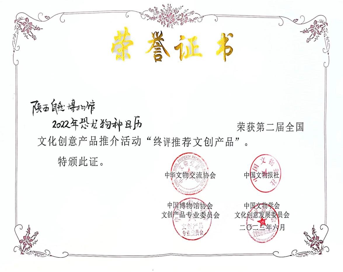 6月5日至6日,第二届全国文化创意产品推介活动终评会暨新时代博物馆文创研讨交流会在深圳博物馆古代艺术馆举行,陕西自然博物馆文创产品《2022年恐龙日历》荣获“终评推荐文创产品”。