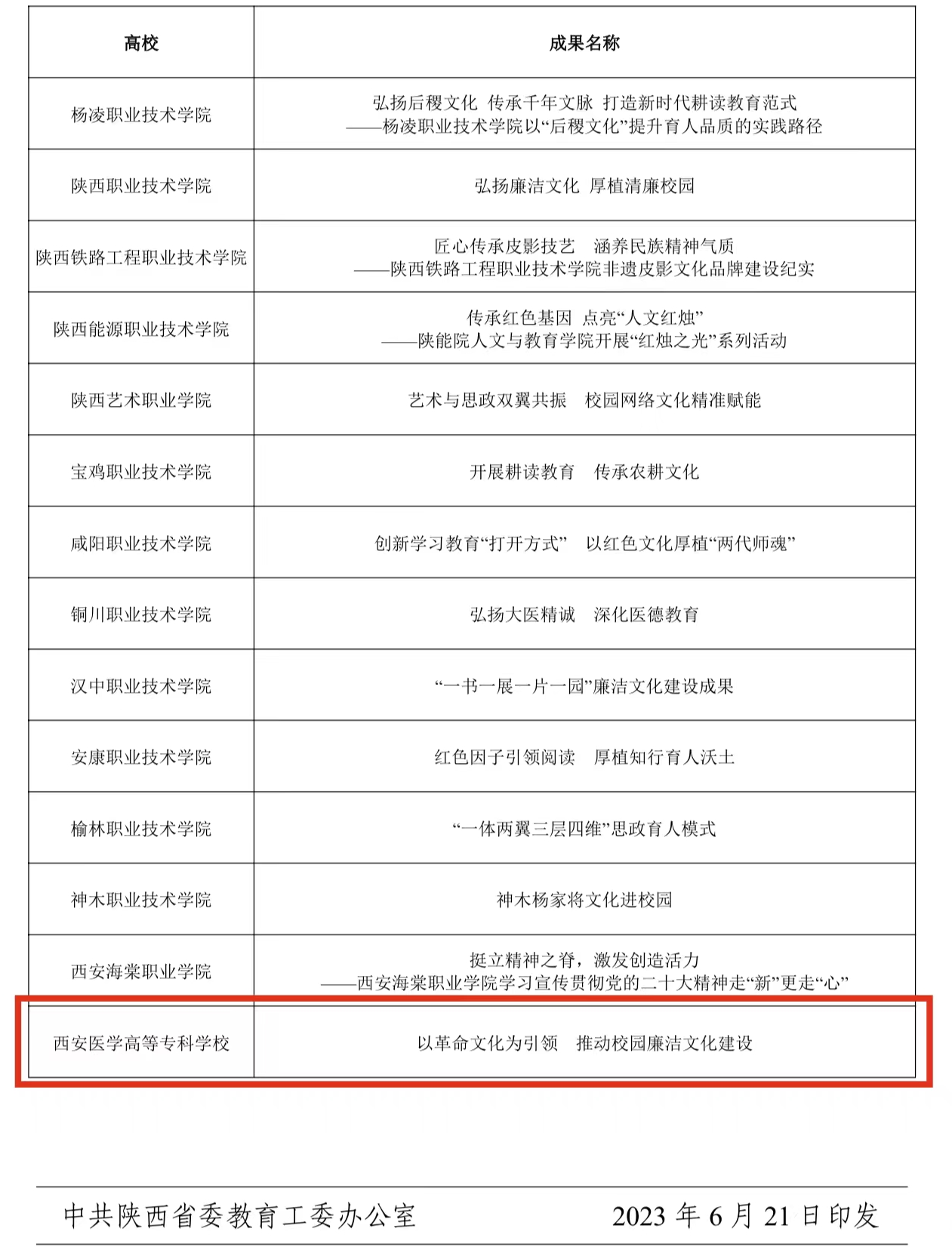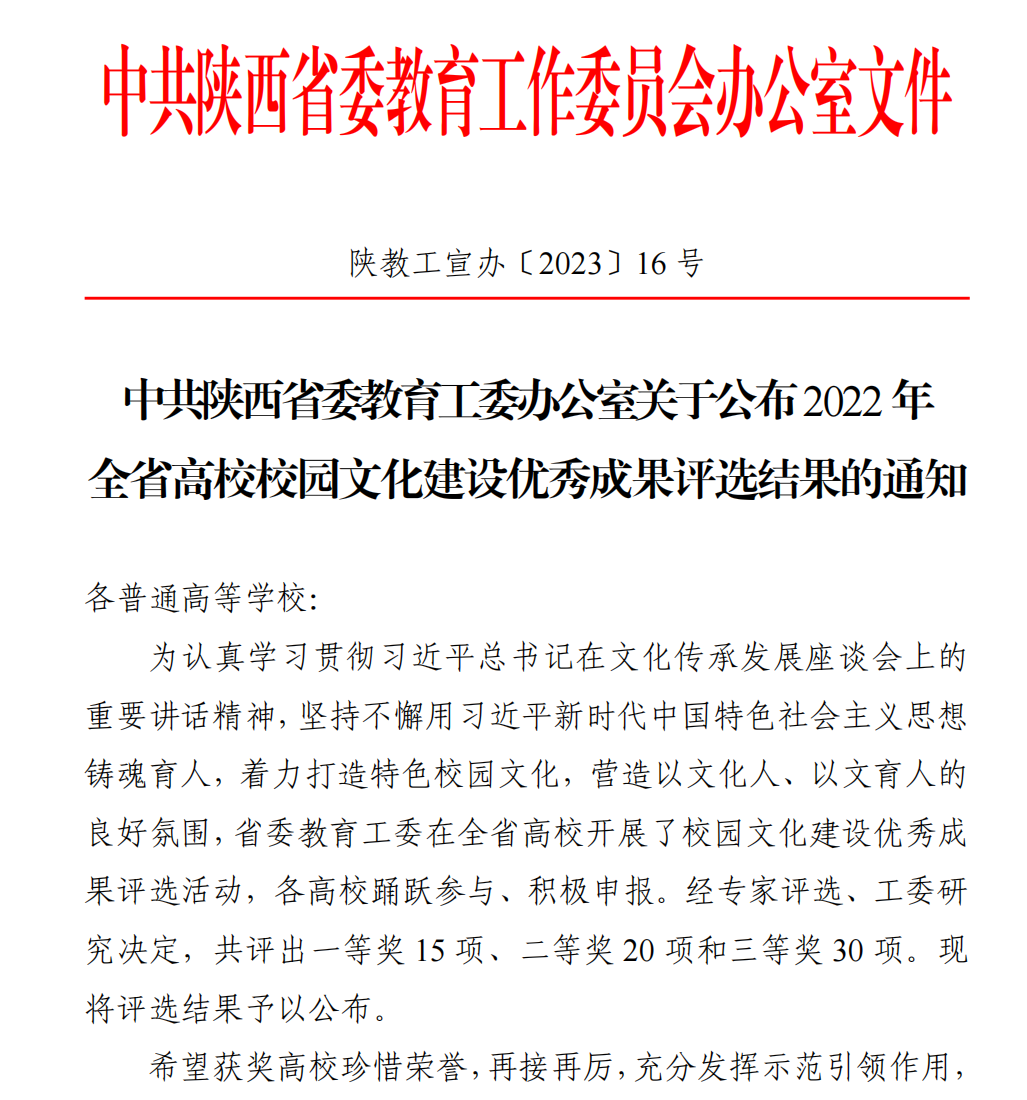 近日,中共陕西省委教育工委发布了《关于公布2022年全省高校校园文化建设优秀成果评选结果的通知》(陕教工宣办〔2023〕16号),我校申报的《以革命文化为引领 推动校园廉洁文化建设》在2022年陕西省高校校园文化建设优秀成果评选中荣获三等奖。学校在历届陕西省高校校园文化建设优秀成果评选活动中殊荣不断,已连续获得二等奖一次,三等奖七次。