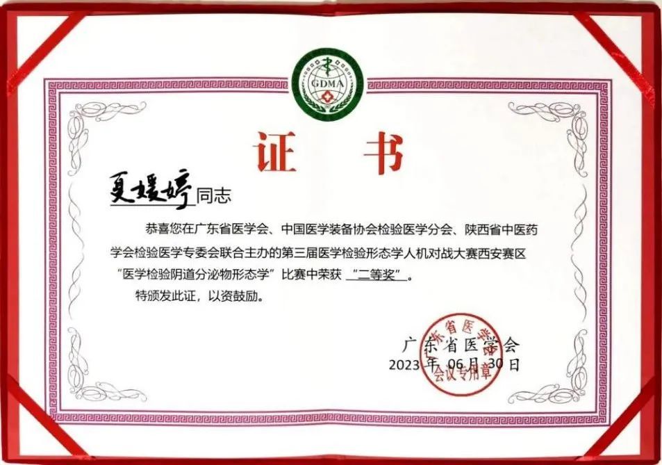 本次大赛分为“血细胞形态组”、“阴道分泌物形态组”、“尿液形态组”赛道,共技47个医疗机构260余名选手参加,竞赛不仅注重形态学判读,更着重考查检验人员的临床思维能力,内容涉及面广、难度较大,对参赛人员具有一定的挑战性。经过4个多小时三轮激烈的竞技,市五院夏媛婷在“阴道分泌物形态组”比赛中取得第二名佳绩,斩获竞赛二等奖,为医院和科室赢得了荣誉。