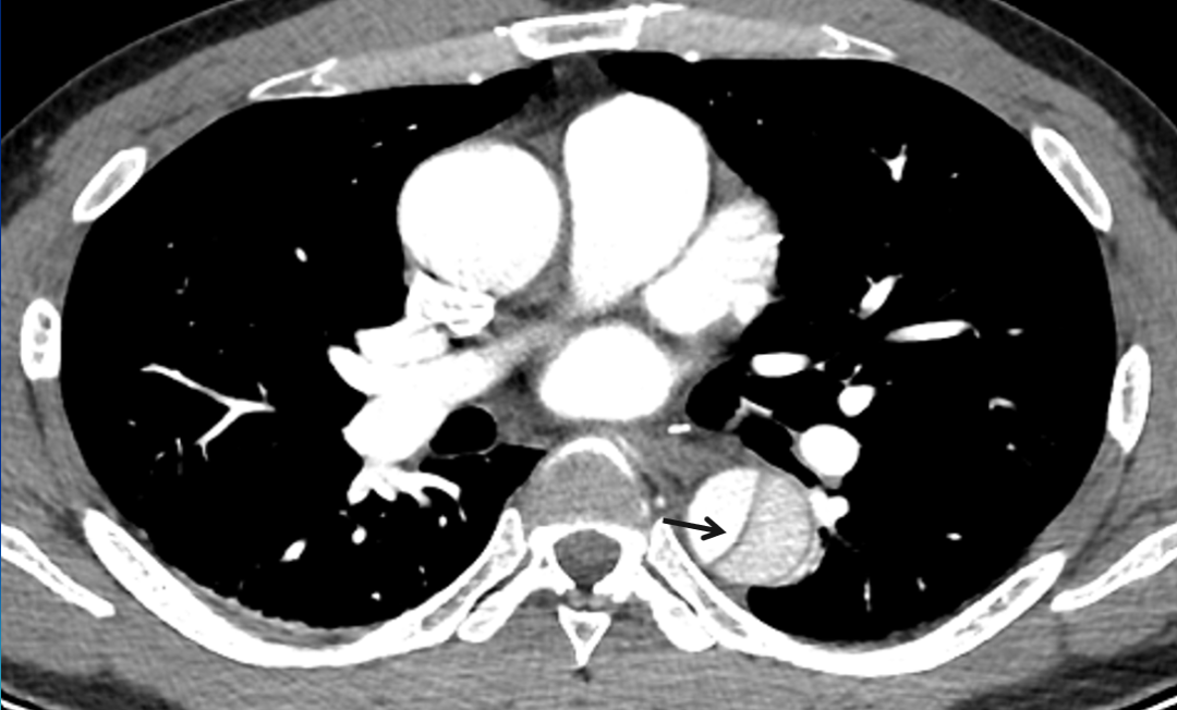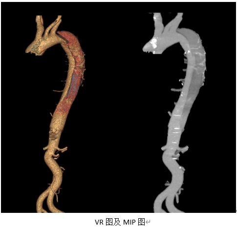 患者,男,40岁。主诉:胸痛1小时入院,无呼吸困难及咳血症状,休息后无缓解,有放射至后背,有高血压病史,D-二聚体0.347mg/l ↑。主动脉CTA血管成像表现如下: