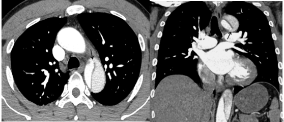 薄层横断面图像及多平面重组图像可以看到夹层破口(黑箭),表现为真腔和假腔之间沟通的通道。