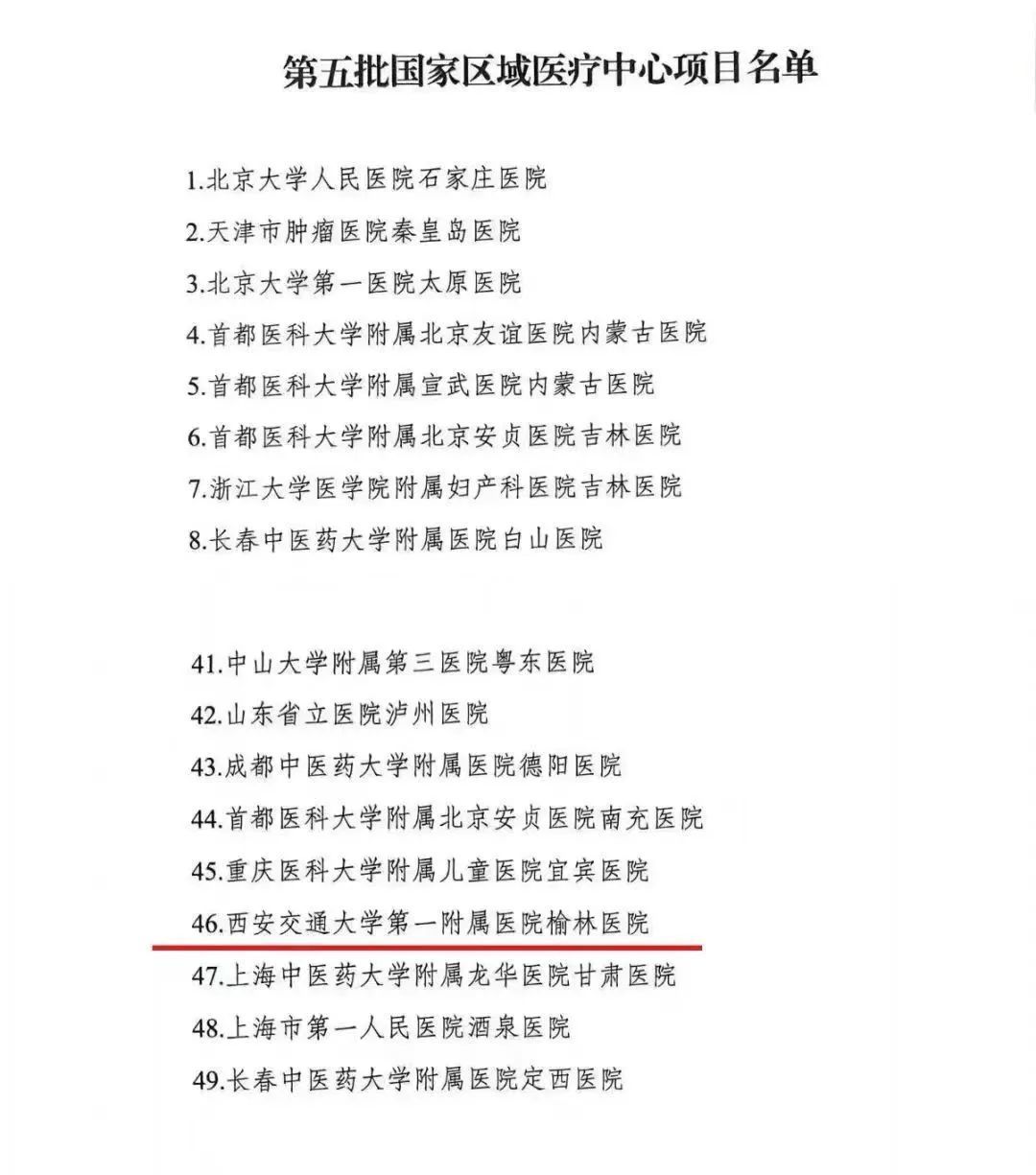 近日,国家发改委、国家卫健委、国家中医药管理局联合公布《第五批国家区域医疗中心项目名单》,以西安交通大学第一附属医院为输出医院,榆林市第二医院为依托医院的西安交通大学第一附属医院榆林医院榜上有名,这既是榆林市第一家,也是陕西省唯一一个入选第五批国家区域医疗中心的项目。