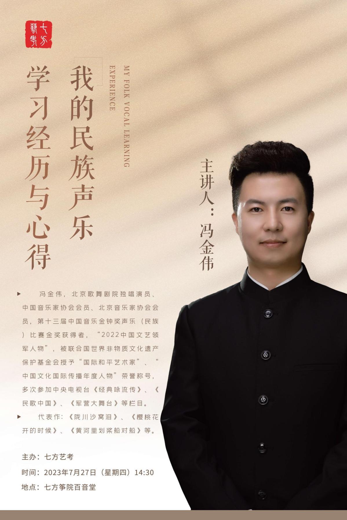 2023年7月27日七方艺考特邀青年歌唱家、第十三届中国音乐金钟奖声乐(民族)“金奖”得主、北京歌剧舞剧院独唱演员冯金伟老师为七方学子及教师进行声乐专题讲学活动。