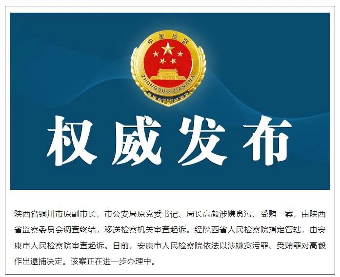 陕西省铜川市原副市长,市公安局原党委书记、局长高毅涉嫌贪污、受贿一案,由陕西省监察委员会调查终结,移送检察机关审查起诉。经陕西省人民检察院指定管辖,由安康市人民检察院审查起诉。日前,安康市人民检察院依法以涉嫌贪污罪、受贿罪对高毅作出逮捕决定。该案正在进一步办理中。