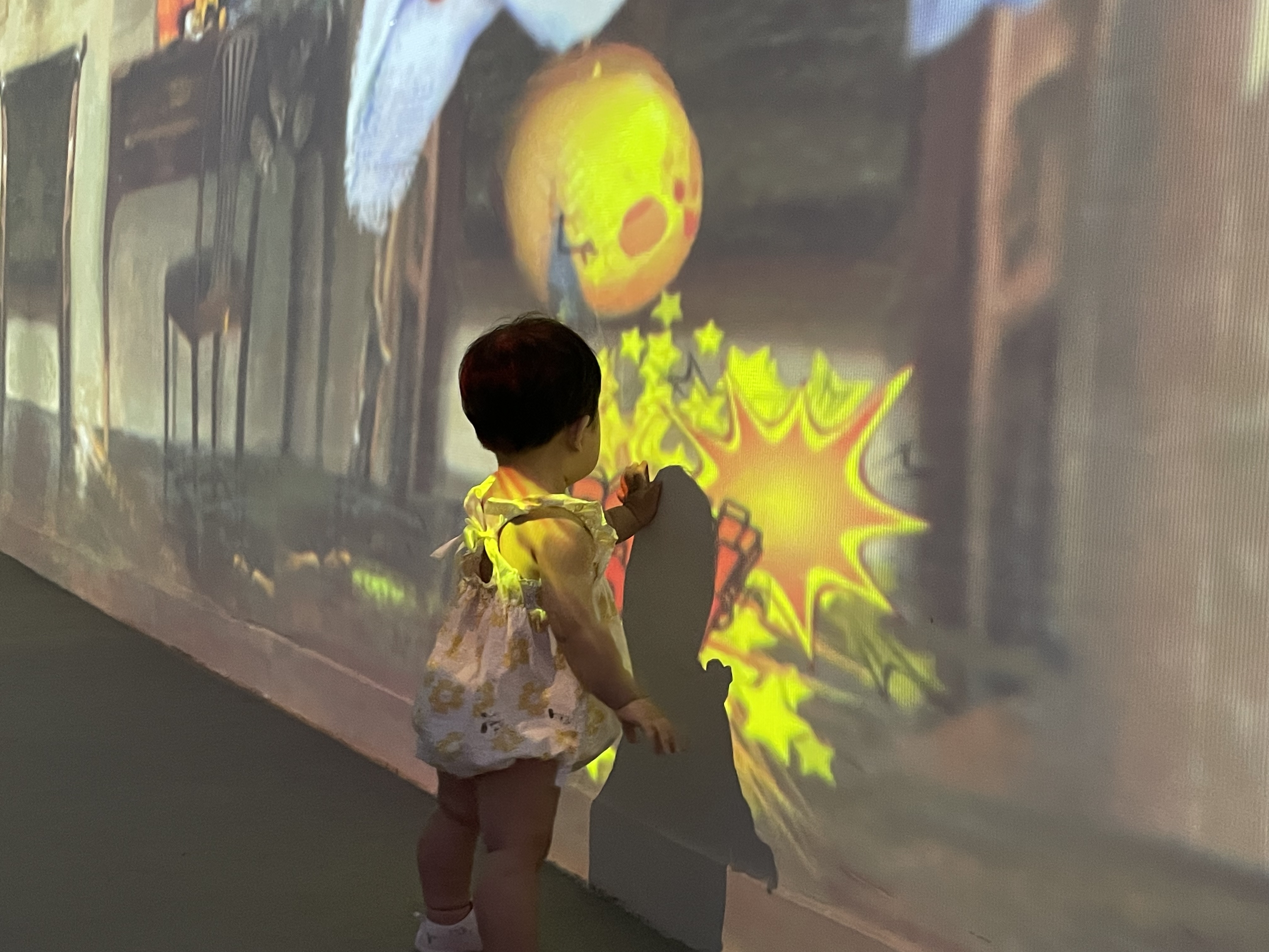 苹果所带来的震撼力,不仅体现在塞尚的油画作品上,也具化在此次沉浸式展览中。展厅内特别设有美育互动装置,通过红外感应交互技术,将孩子们的涂鸦水果投入到塞尚作品的虚拟场景中,“涂鸦水果” 即刻“变活”,就像神笔马良画画一般神奇。孩子们可以通过触碰的方式与自己画的水果进行互动玩耍,仿佛与塞尚一同创作出了全新的艺术作品。
