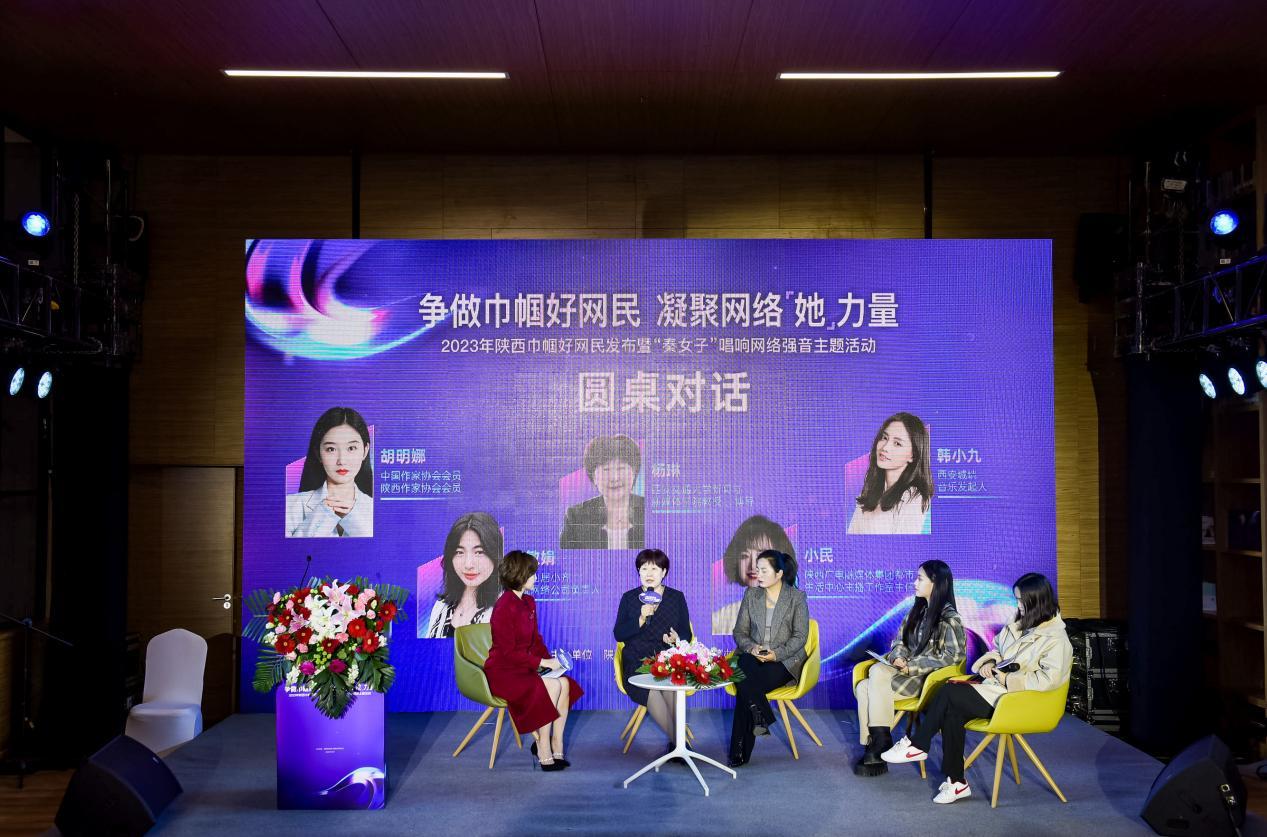 圆桌对话环节,由陕西广电融媒体集团都市生活中心主播工作室主任小民主持,西安交通大学新闻与新媒体学院教授、博导杨琳,宝鸡山居小齐科技网络公司负责人齐敏娟,西安城墙音乐发起人韩小九,中国作家协会会员、陕西作家协会会员胡明娜四位嘉宾围桌畅谈,共话网络时代全新巾帼梦想。