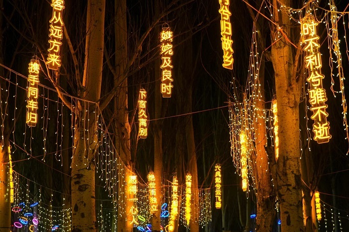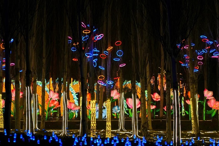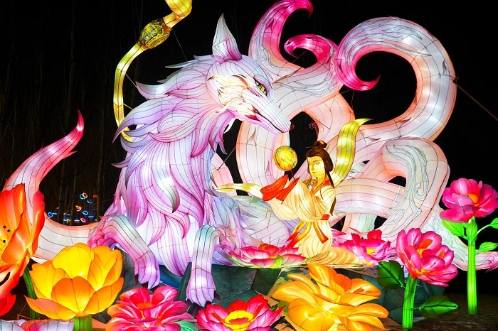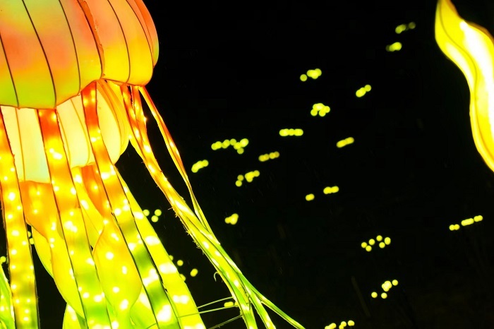 一步一景,处处有故事。上古神话中九尾狐、青龙等充满神秘感的“神兽”,在五彩斑斓的灯光下生动呈现;鸟语花香、鱼舞光影、花儿朵朵、诗情画意等造型各异的花灯,完美嵌合在树木花草间,亦真亦假;浪漫水母、精灵世界、可爱趴趴熊等充满童趣的花灯,为游客营造萌趣新奇玩乐互动打卡空间;除了鲲鹏、百灵狐妖,还有藏于花灯间的“彩蛋”等待游客去探索发现。