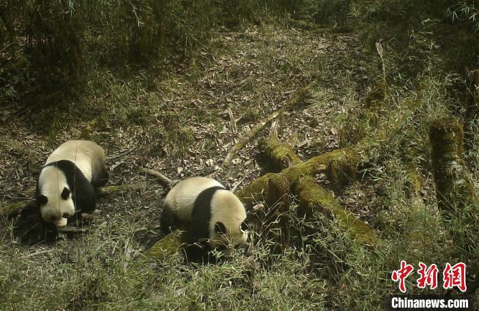 中新网雅安5月17日电 (刘刚 王思芦 )5月17日,大熊猫国家公园雅安市宝兴县蜂桶寨片区通报称,近日,工作人员在清理红外相机资料时,发现拍摄到两只野生大熊猫结伴外出玩耍的画面。