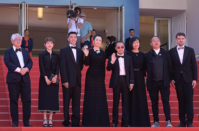 1905电影网讯 法国当地时间5月18日,第77届戛纳电影节主竞赛入围影片《风流一代》举行全球首映礼。影片导演贾樟柯,主演赵涛,摄影指导余力为,监制梁嘉艳、市山尚三,联合编剧万佳欢等主创亮相首映红毯。