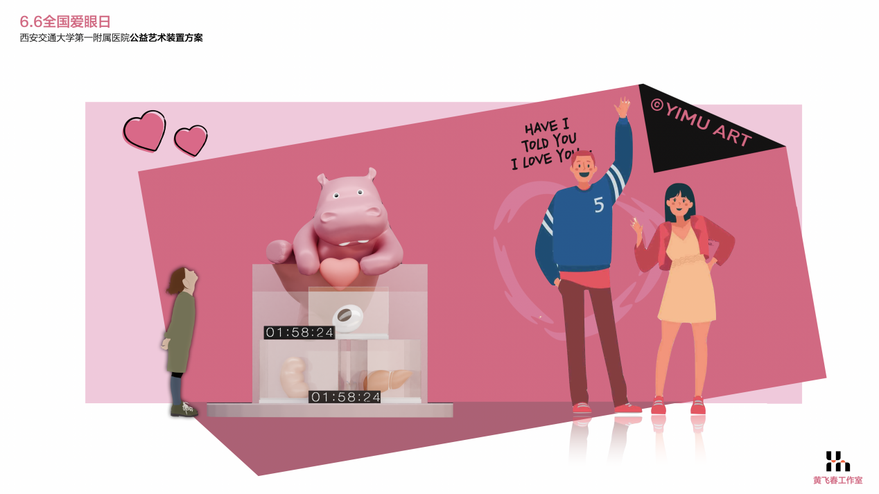 黄飞春工作室将旗下著名原创IP「粉色河马[HIPPOGO!」免费授权,用于西安交通大学第一附属医院眼科角膜移植的相关公益宣传,让自然主义公共艺术所传递出的友好互动,协力支持角膜捐献移植事业的发展。