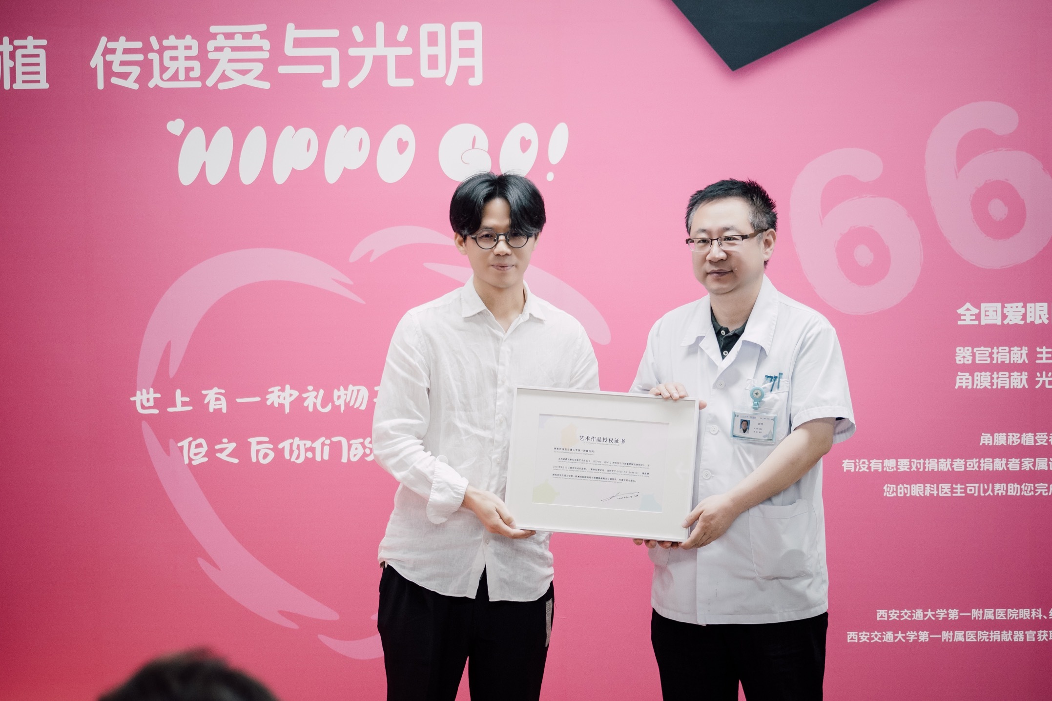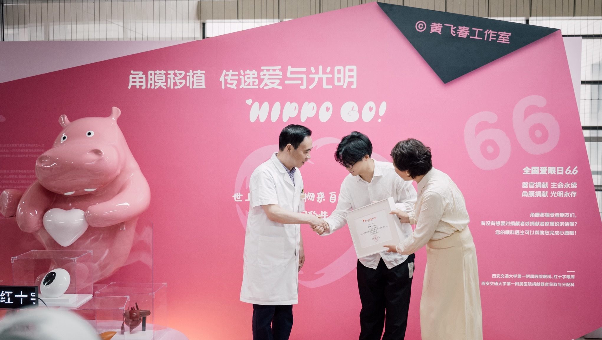 2024年6月6日全国爱眼日,粉色河马「HIPPOGO!」化身公益使者,艺术家黄飞春与西安交通大学第一附属医院携手合作,聚焦角膜捐献移植技术的推广,传递温暖与爱心,并促进艺术与医术的跨界传播。