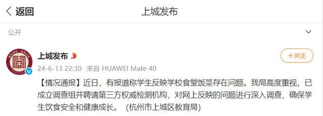 原标题:杭州上城区官方通报学生反映学校食堂饭菜存在问题:已成立调查组