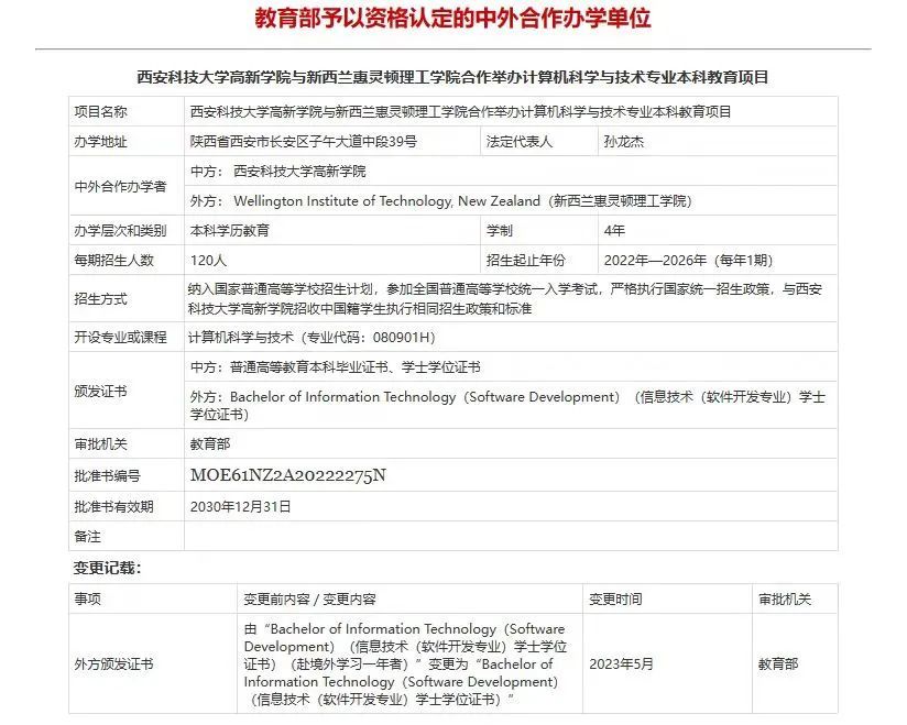 本项目是经教育部批准,由西安科技⼤学⾼新学院与新西兰惠灵顿理工学院( Wellington Institute of Technology)合作举办的高质量、高水平的中外合作办学项目,招生纳⼊国家普通高等教育招生计划。教育部批准书编号:MOE61NZ2A20222275N。