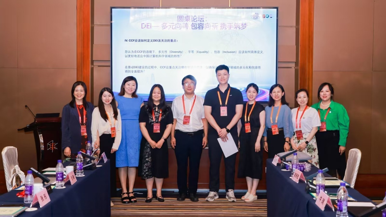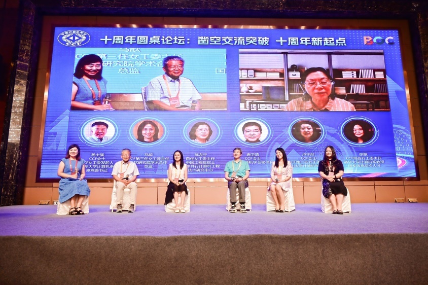 大会举行了“凿空交流突破,十周年新起点” CCF女工委十周年圆桌论坛,由CCF女工委主任助理、鹏城实验室助理研究员、博士生导师张彤主持。CCF会士、CCF秘书长唐卫清,CCF会士、CCF首任女工委主任、国家并行计算机工程技术研究中心陈左宁院士,CCF会士、CCF第二任女工委主任、中山大学教授卢宇彤,CCF第三任女工委主任、微软研究院学术合作总监马歆,CCF现任女工委主任、清华大学教授张敏,CCF女工委发起人、清华大学教授杨士强六位嘉宾参与十周年圆桌讨论。嘉宾们从女工委建立的初心、女性计算机工作者调研报告、计算之美系列活动、促进科技发展、CCF理事女性比例等多个维度回顾了CCF女工委十年发展历程,展望未来,女工委将继续发挥平台的连接优势,推进DEI(多元、平等、包容)文化建设,帮助女计算机工作者提升能力,激励发展。