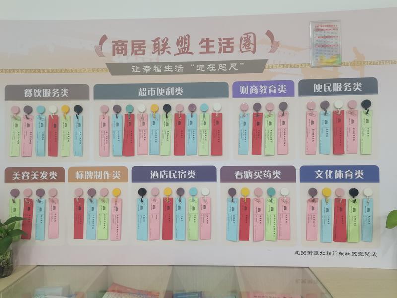 “用服务换服务,将接受居民问询变为主动服务,努力做居民贴心的‘金牌店小二’。”北稍门东社区党总支书记兼居委会主任李娇娇告诉记者,社区工作人员入户走访时,经常有老年居民询问哪里有价格实惠理发好的理发店、哪里有修锁搬家的公司、哪家药店比较好等问题。考虑到老人们大多不会使用智能手机,社区决定制作一些方便居民携带和保存的“便民条”。去年7月初,社区工作人员在经过实地走访和调研民情后,从辖区192家门店中选出49家,分类制作“便民条”,布置在社区便民服务大厅,方便前来办事的居民查阅和取走保存。