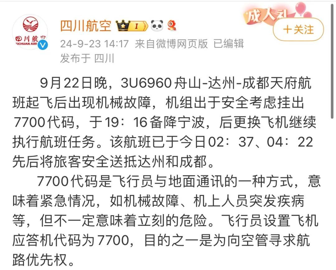 7700紧急代码紧急备降宁波”一事