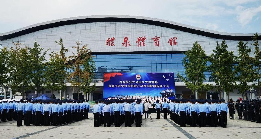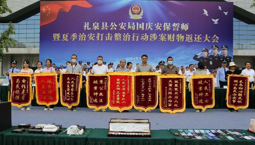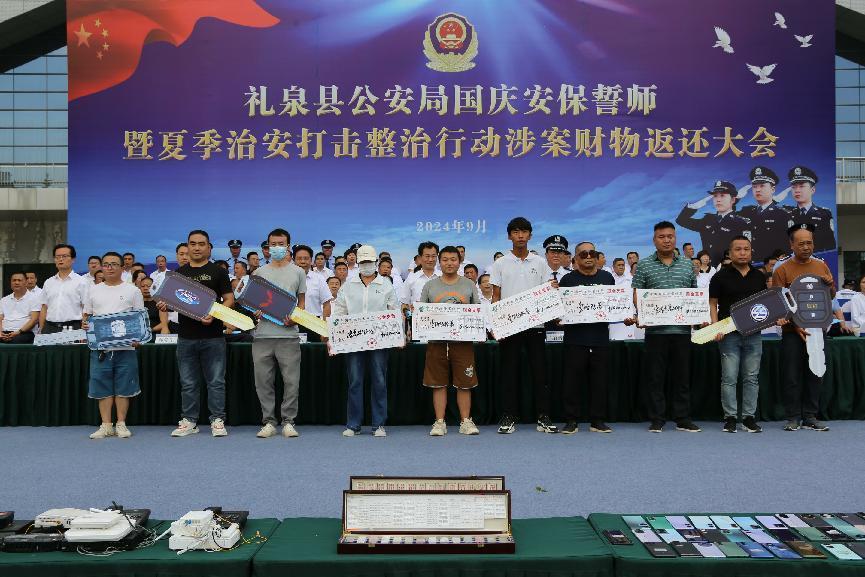 为迎接中华人民共和国成立75周年,9月25日,礼泉县公安局在县体育馆南广场举办国庆安保誓师暨夏季治安打击整治行动涉案财物返还大会。集中展现夏季治安打击整治行动成果,积极营造全警动员、全力以赴完成国庆安保各项任务的浓厚氛围,向全县广大父老乡亲展示公安机关打击各类违法犯罪活动、坚决维护全县政治稳定和社会治安大局持续平稳的决心信心。