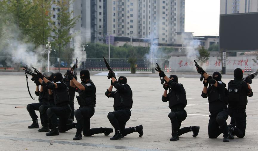 随后,大会现场为部分受害群众返还了涉案财物,受害群众代表向公安机关赠送锦旗并作发言。在国庆安保誓师环节,巡特警大队、交警大队等分别就特警枪械战术动作、交警铁骑驾驶技能、三大步伐、交通指挥手势等科目进行演练,并现场模拟群体性突发事件处置演练;所有参会民辅警进行集体宣誓。