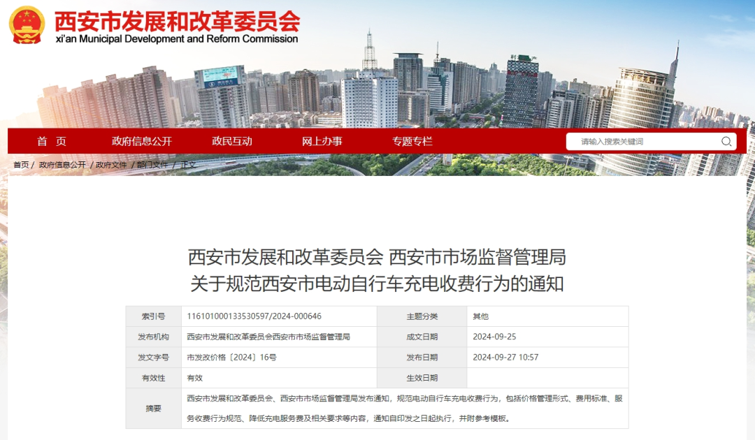 9月26日,西安市发展改革委西安市市场监管局发布《关于规范西安市电动自行车充电收费行为的通知》。