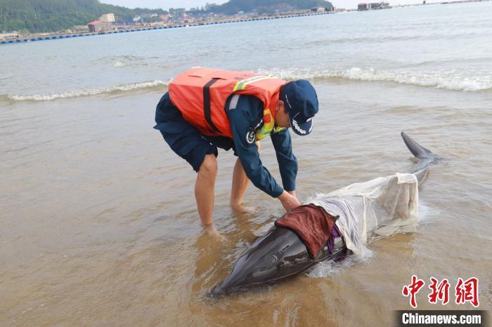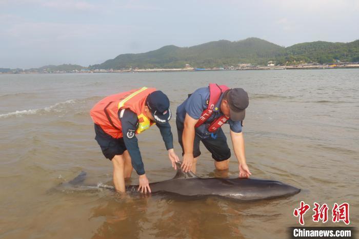 原标题:福建漳州海警紧急救助一只搁浅海豚