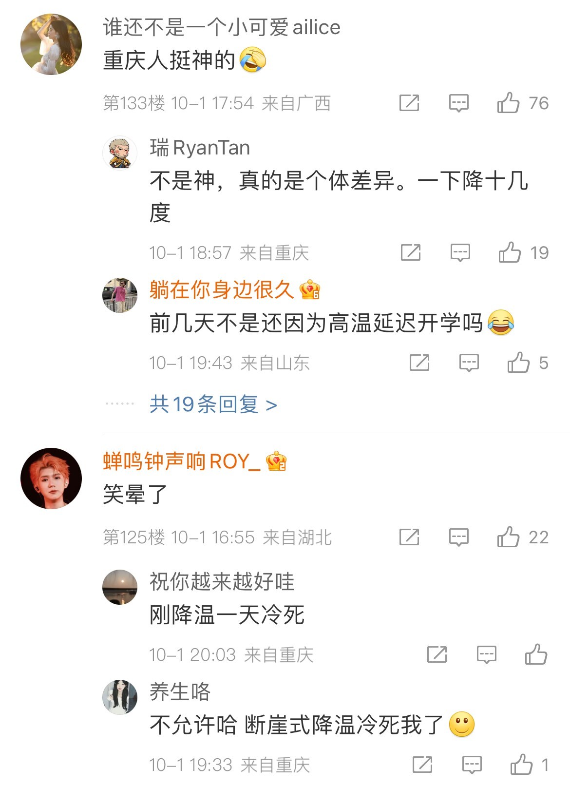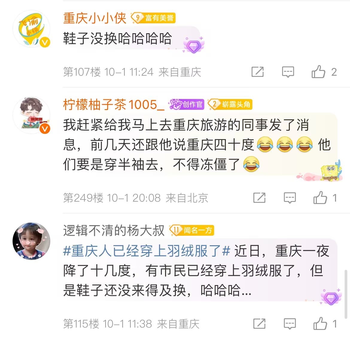 不过,最令人担心的是一波已经在去往重庆路上的游客了,也有网友调侃:“我要穿着羽绒服吃火锅了”,“有没有本地重庆人现身说法啊啊!到底穿啥!”“谢邀,人已到重庆,冻得发麻!”