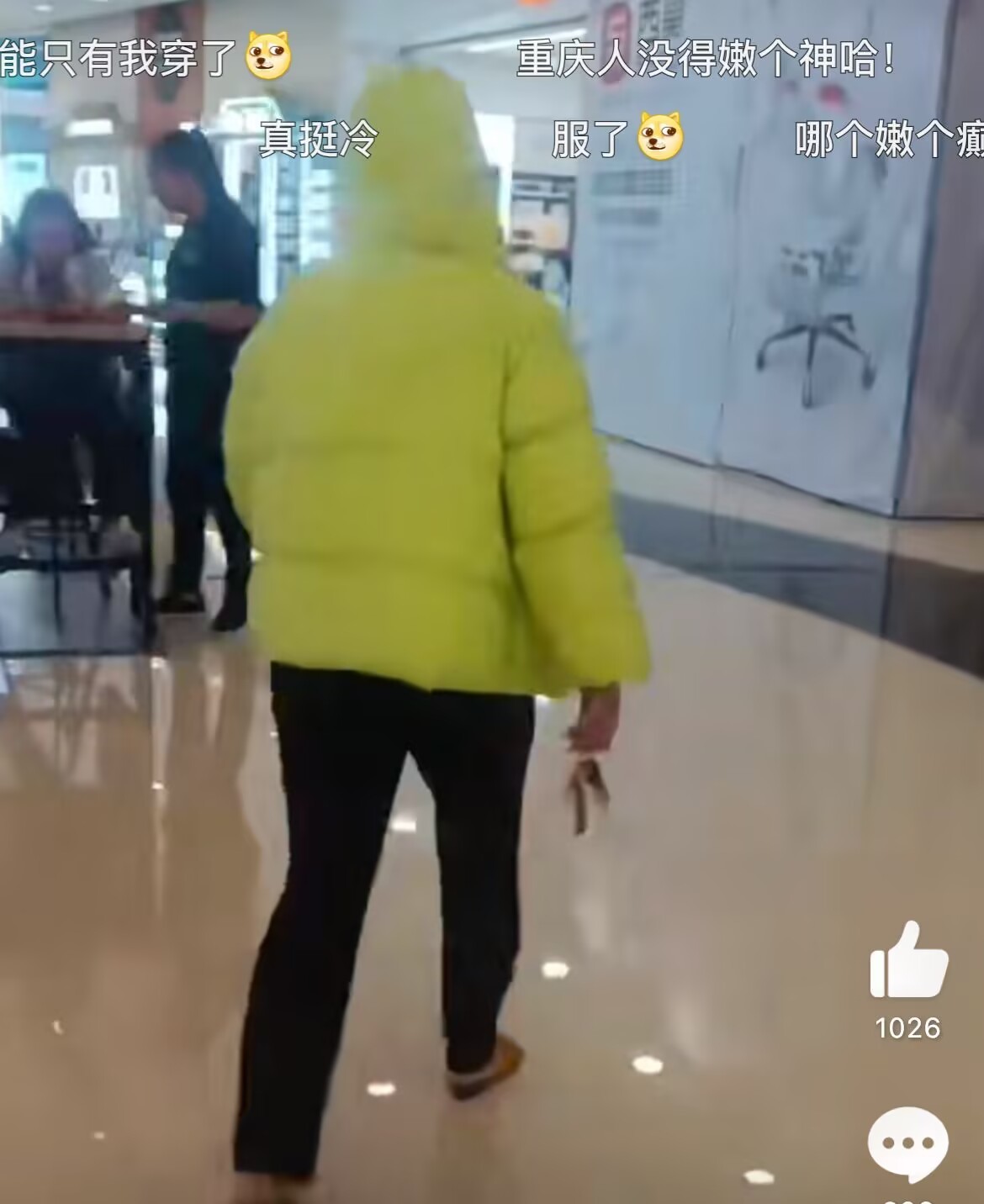 据中国天气的图显示,重庆气温呈现断崖式下跌,有网友在重庆某商场拍到有市民穿着厚厚的荧光绿羽绒服。但是脚上还踩着双拖鞋,还没完全切换到冬季模式,有网友调侃:“上半身冬天,下半身夏天”“换了还没完全换”。