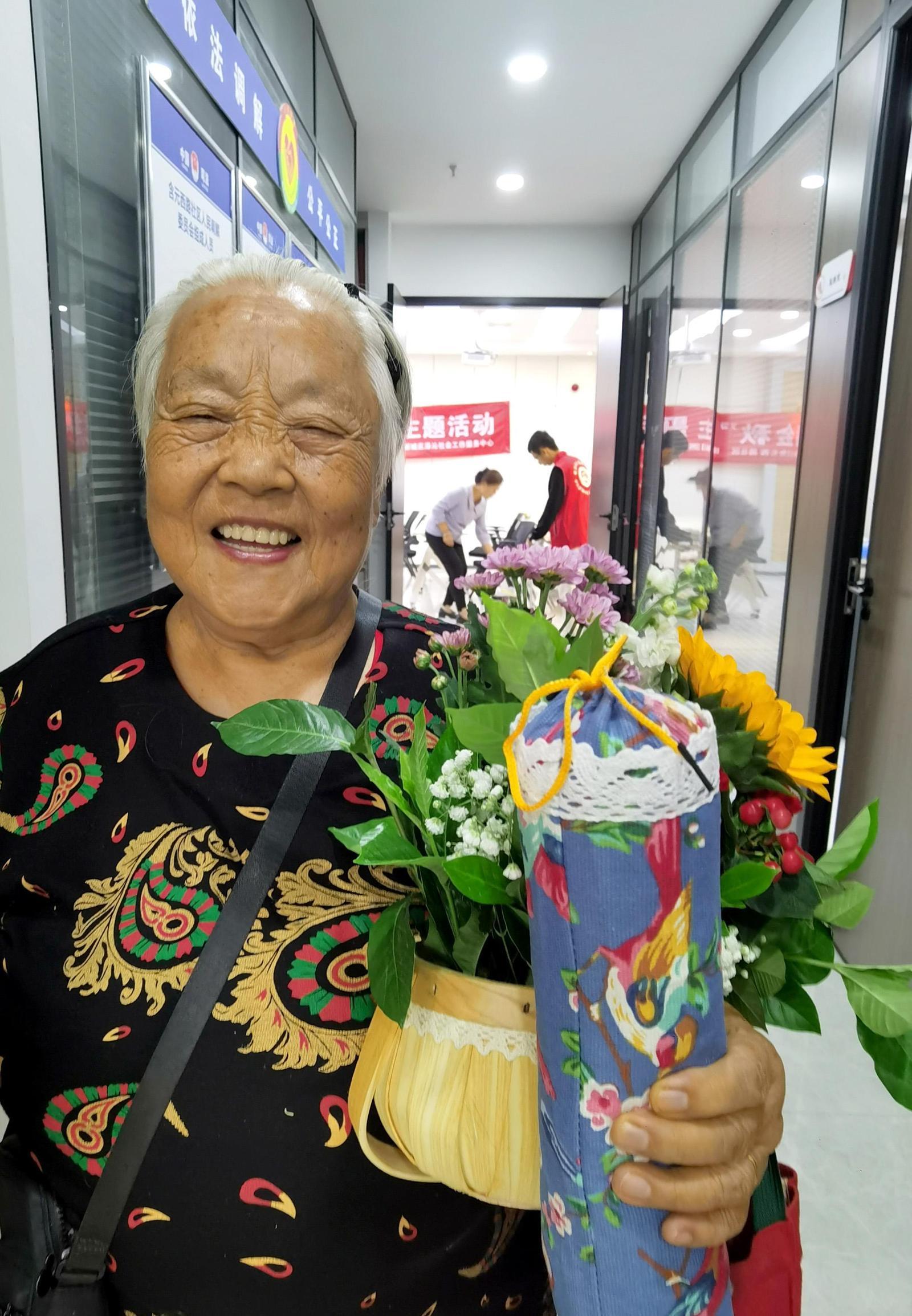 活动中,老年人和大学生志愿者纷纷上台,各展才艺,同台“比拼”,在轻松愉悦的节日氛围中,共迎重阳佳节。另外,大学生志愿者还和老年人一起制作了艾草枕和花篮,在动手中感受了节日的乐趣。