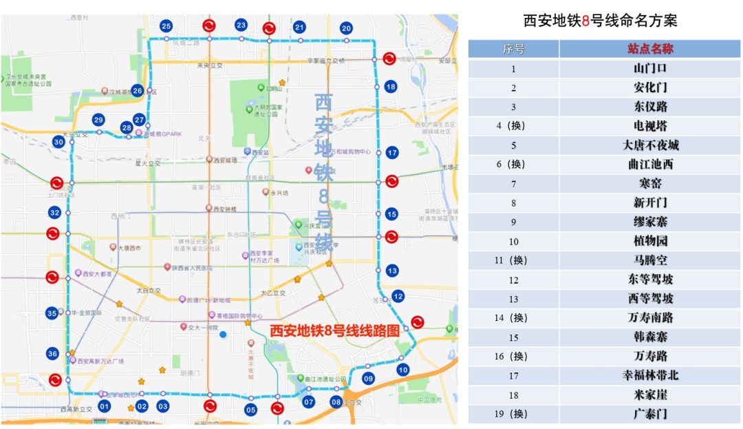 山门口、安化门、东仪路、电视塔(2号线已命名换乘站)、大唐不夜城、曲江池西(4号线已命名换乘站)、寒窑、新开门、缪家寨、植物园、马腾空(5号线已命名换乘站)、东等驾坡、西等驾坡、万寿南路(6号线已命名换乘站)、韩森寨、万寿路(1号线已命名换乘站)、幸福林带北、米家崖、广泰门(3号线已命名换乘站)、北辰东路、井上村、余家寨(4号线已命名换乘站)、市第三医院、市图书馆(2号线已命名换乘站)、霸城门、大风阁、红庙坡、景曜门、光化门、白家口、开远门(1号线已命名换乘站)、土门、金光门(5号线已命名换乘站)、延平门(3号线已命名换乘站)、科技二路、木塔寺西、省体育馆(6号线已命名换乘站)、雁鸣湖(车辆段)、永城路(停车场)。