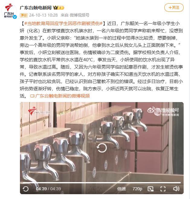 韶关市乳源瑶族自治县教育局副局长冯春润向记者表示,涉事男生对受伤孩子所实施的是临时起意的恶作剧,不是蓄意或恶意实施的情形。经查涉事学校的直饮水机因非为人为故障导致水温异常,也是导致此事件原因之一,学校负有安全管理的责任。