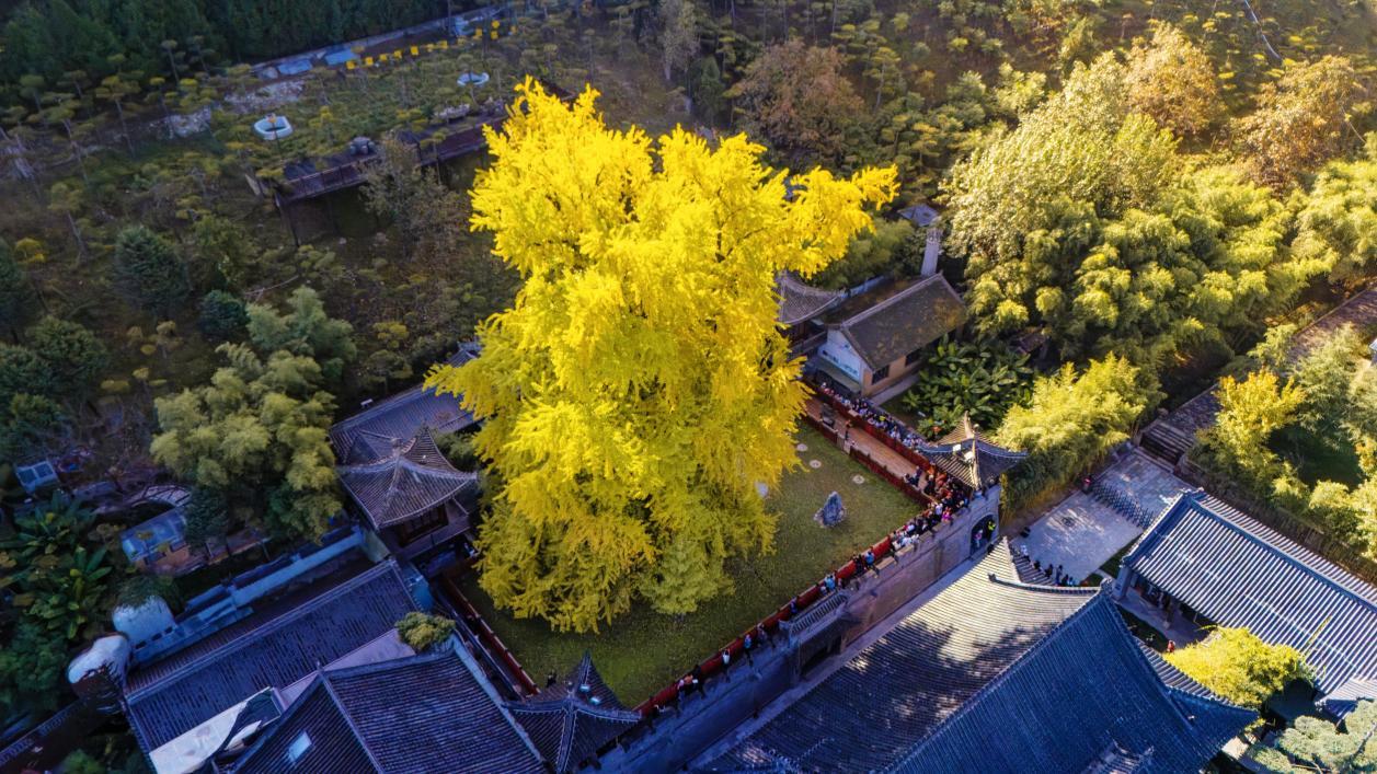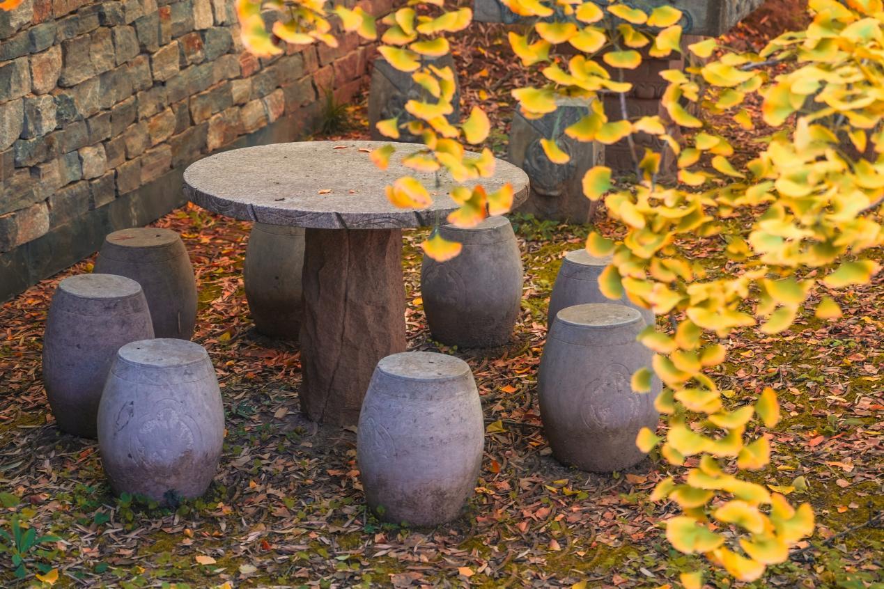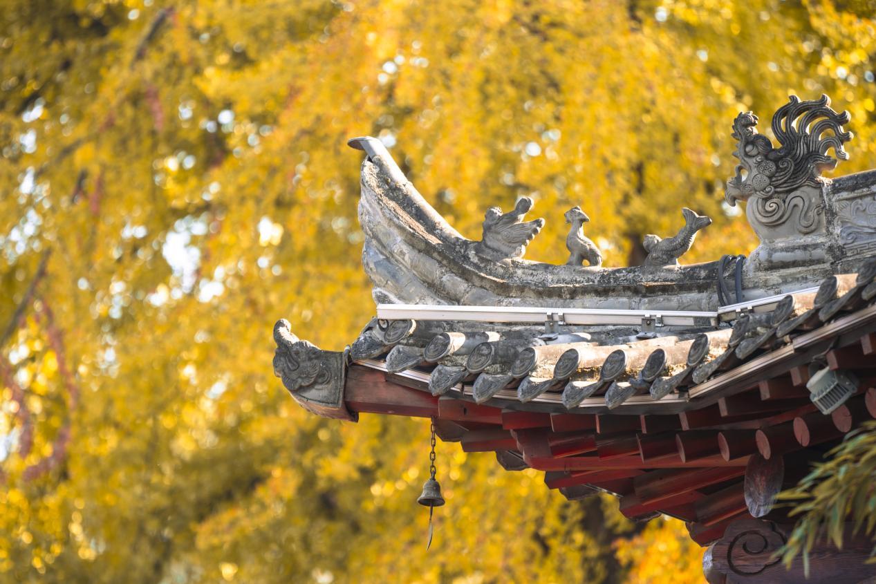 一入秋,西安就成了长安。终南山下的古观音禅寺便是赏秋打卡的好去处,满地金黄,洒落一地的银杏叶就像金黄的地毯,别有一番韵味。在古寺讲解员的带领下,打卡团行至高台共同观赏那棵令无数人魂牵梦萦的千年银杏。一千四百年的光阴流转,古寺古树古风犹存,落满黄叶的石桌石椅,屋檐下静挂的清脆铜铃,仿佛千年前亦是如此从未变过。